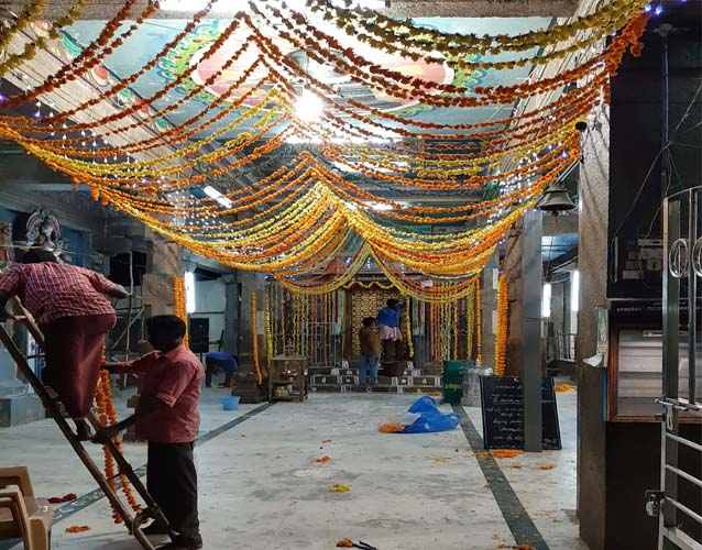 மாங்கனித்திருவிழா உற்சவம் முன்னிட்டு தொடர் அன்னதானம் அம்மையார் சன்னதியில் மலர் பந்தல் அலங்காரம் .