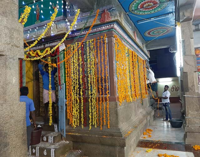 மாங்கனித்திருவிழா உற்சவம் முன்னிட்டு அம்மையார் சன்னதியில் மலர் பந்தல் அலங்காரம் .
